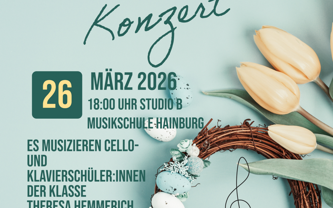 Osterkonzert – 26.03.2026, 18:00 Uhr, Studio B von Musikschule Hainburg | Feb. 25, 2026 | Konzert | 0 Kommentare …Es musizieren Cello- und Klavierschüler:innen der Klasse Theresa Hemmerich… / Freie Platzwahl / Eintritt: Freie Spende